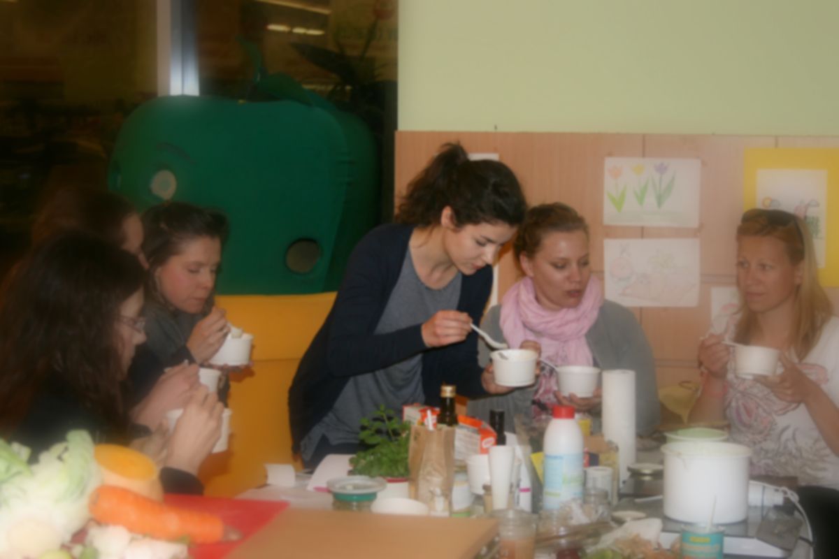 Na pomladni Kalčkovi kuharski ustvarjalnici (april 2015) smo prav tako preizkušali raznolike ekološke sestavine in začimbe ter iz njih skuhali lečino curry juhico, hranljivo brokolijevo juho s kvinojo in mandlji, osvežilno koromačevo juho ter tajsko kokosovo juho z ingverjem.